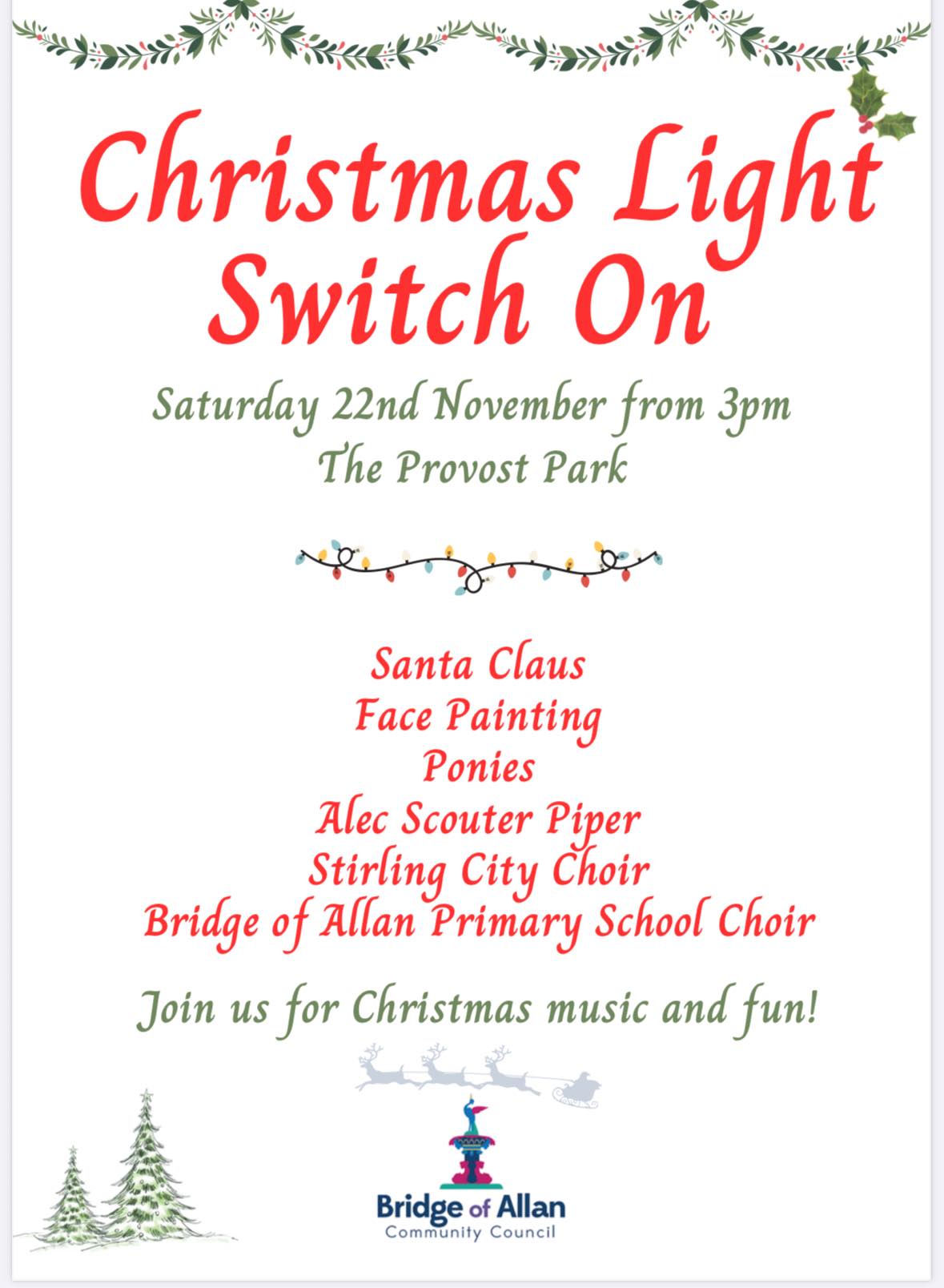 Provost's ParkThe Bridge of Allan Christmas Lights switch on will be on November 22nd, from 3pm at the Provost's Park.