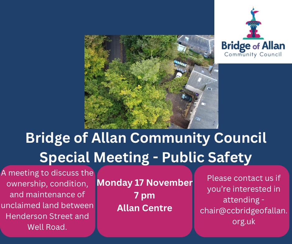 Allan Centre Fountain Road, Bridge of AllanA meeting to discuss the ownership, condition and maintenance of trees and infrastructure on unclaimed land between Henderson Street and Well Road.