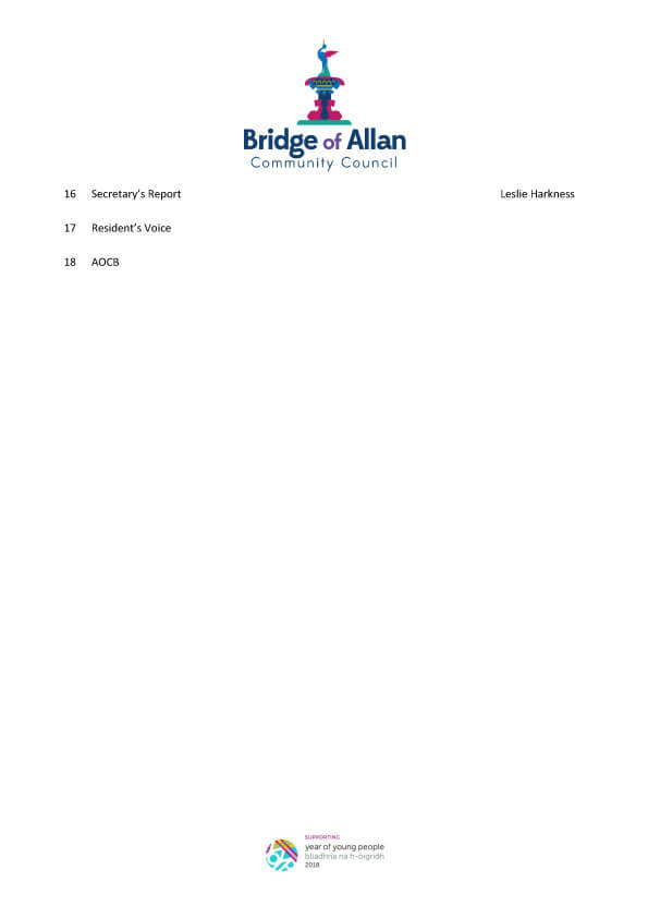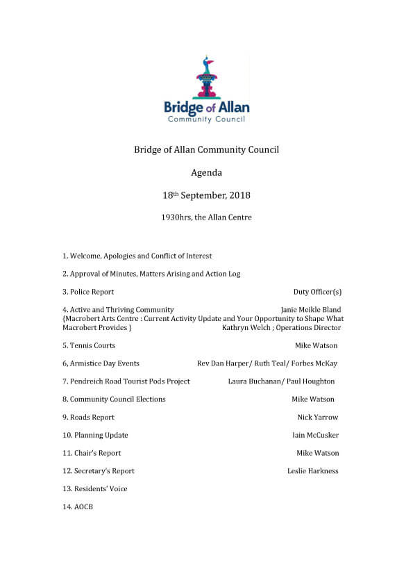 Bridge of Allan Community Council’s next meeting will be held after our AGM on Tuesday 21st August at 7.30pm in the Allan Centre, Fountain Road, Bridge of Allan. The proposed meeting agenda is attached.